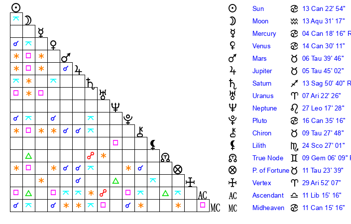 | Moon | 13 Aquarius 36 | 15 Scorpio 30 | 12 Virgo 45 |