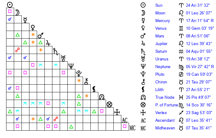 | Sun | 24 Aries 31 | 25 Aries 0 | 23 Cancer 54 |