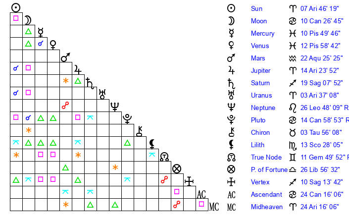 | Pluto | 14 Cancer 59 | 3 Aquarius 30 | 16 Cancer 33 |