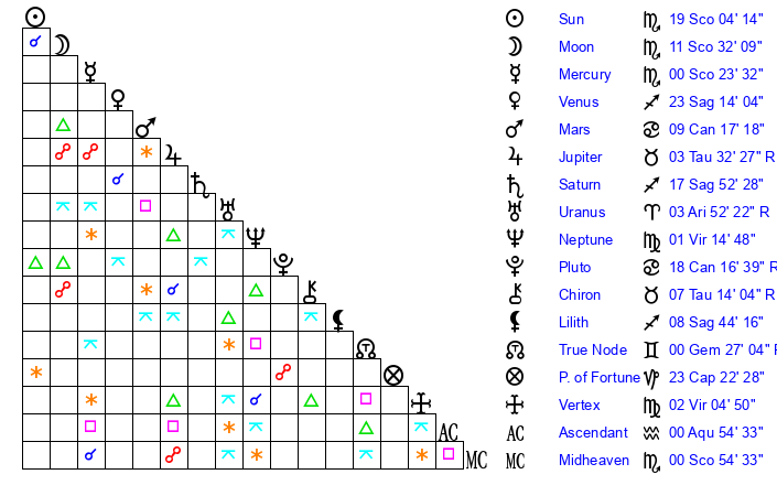 | Sun | 19 Scorpio 4 | 19 Scorpio 33 | 27 Aquarius 34 |