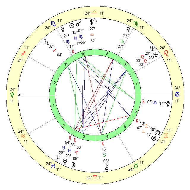| Moon | 6 Aries 58 | 0 Gemini 53 | 10 Scorpio 56 |