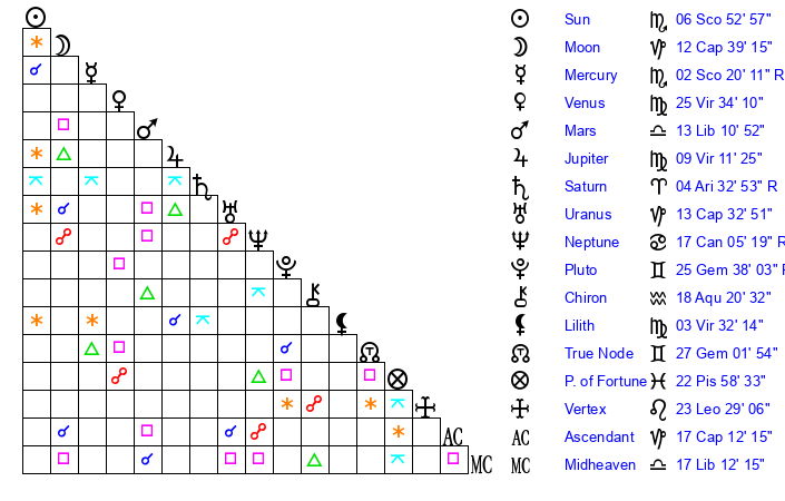 Moon | 12 Capricorn 38 | 17 Libra 57 | 20 Aries 22 |