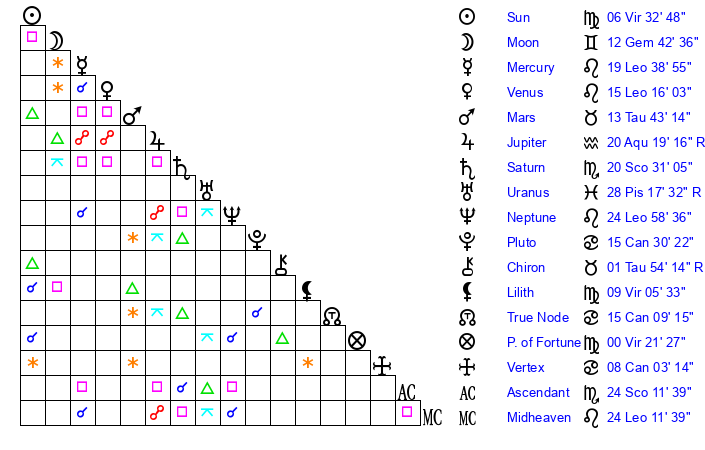 | Mercury | 19 Leo 39 | 24 Leo 39 | 25 Scorpio 36 |