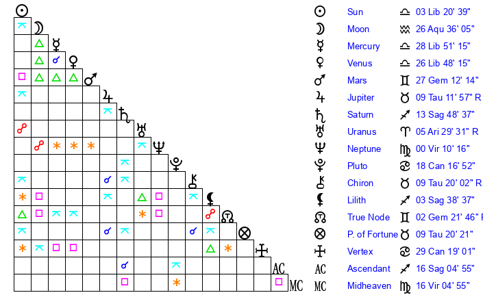 | Venus | 26 Libra 49 | 8 Virgo 47 | 24 Aquarius 27 |