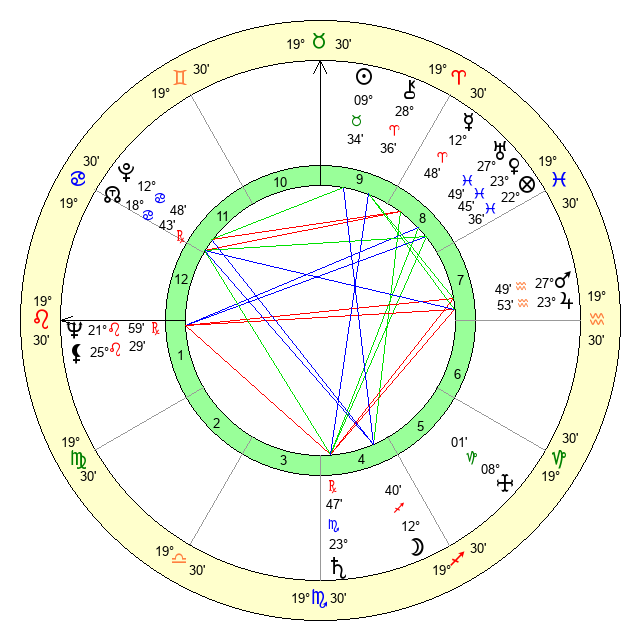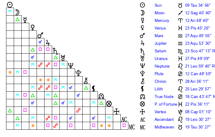 | Moon | 12 Sagittarius 45 | 21 Gemini 21 | 4 Leo 47 |