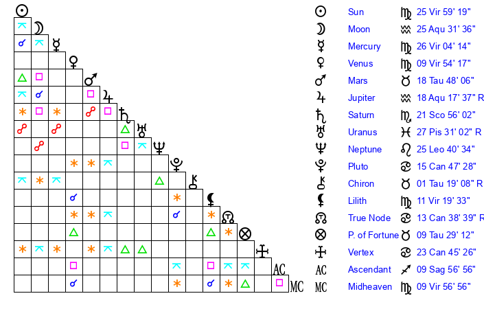 | Moon | 25 Aquarius 36 | 2 Virgo 17 | 10 Libra 35 |