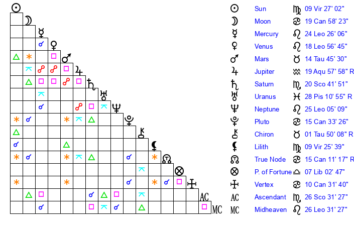 | Venus | 18 Leo 57 | 9 Leo 36 | 22 Sagittarius 35 |