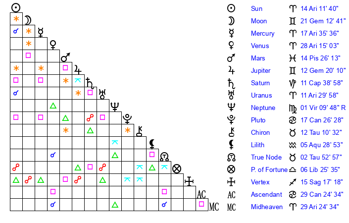 Sun | 14 Aries 12 | 15 Aries 10 | 15 Cancer 47 |