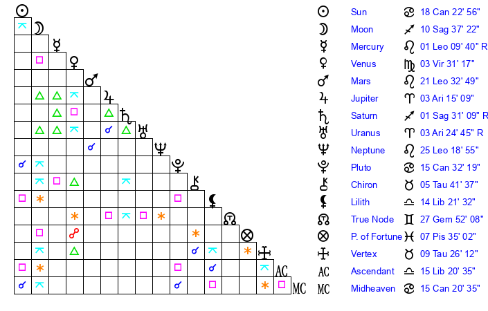 | Moon | 10 Sagittarius 39 | 29 Capricorn 53 | 24 Cancer 32 |