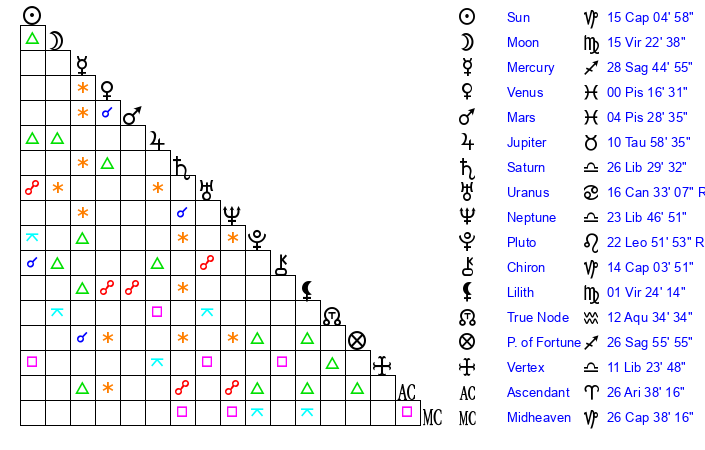 | Venus | 0 Pisces 16 | 15 Capricorn 8 | 1 Taurus 6 |