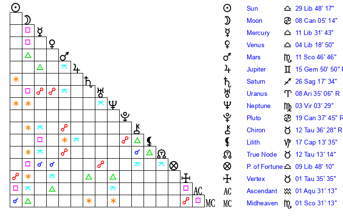 | Sun | 29 Libra 48 | 0 Scorpio 32 | 7 Aquarius 3 |