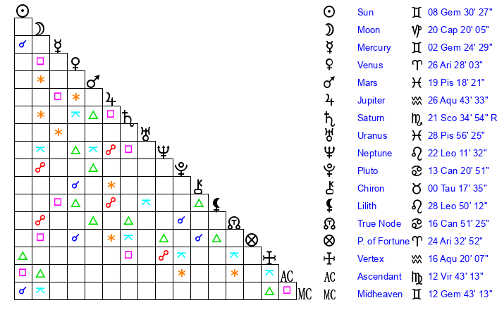 | Jupiter | 26 Aquarius 38 | 27 Gemini 43 | 19 Aquarius 24 |