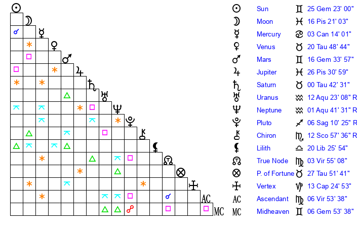 Moon | 16 Pisces 18 | 29 Aquarius 53 | 13 Pisces 7 |