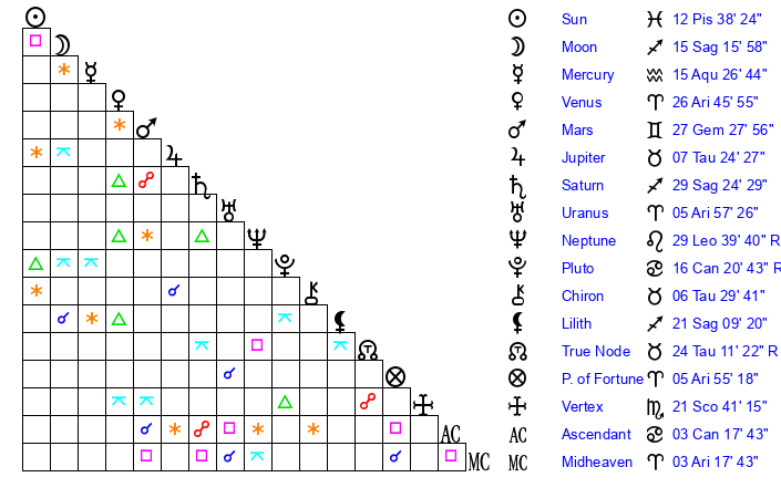 | Sun | 12 Pisces 39 | 13 Pisces 22 | 16 Gemini 26 |