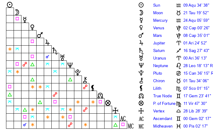 | Moon | 21 Taurus 26 | 26 Aquarius 25 | 6 Sagittarius 7 |