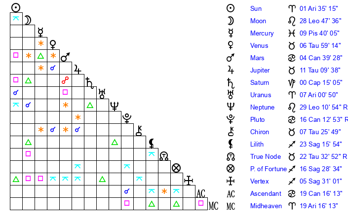 | Sun | 1 Aries 35 | 2 Aries 19 | 4 Cancer 34 |