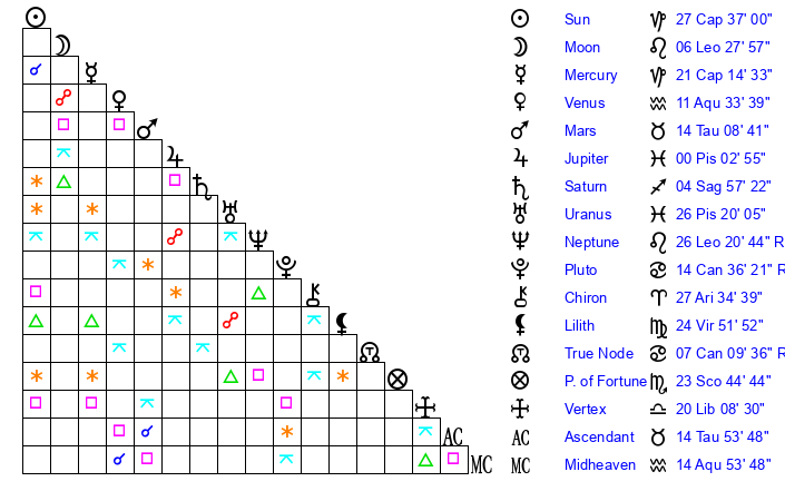| Neptune | 26 Leo 20 | 27 Pisces 37 | 24 Leo 13 |
