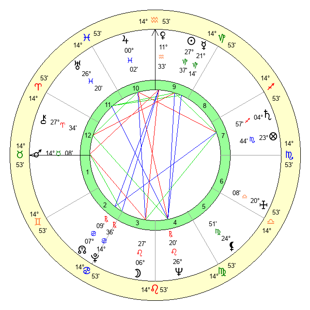 | Moon | 6 Leo 23 | 24 Virgo 40 | 28 Aquarius 27 |