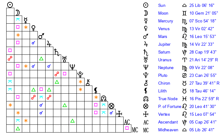 | Sun | 25 Libra 6 | 25 Libra 34 | 29 Capricorn 12 |