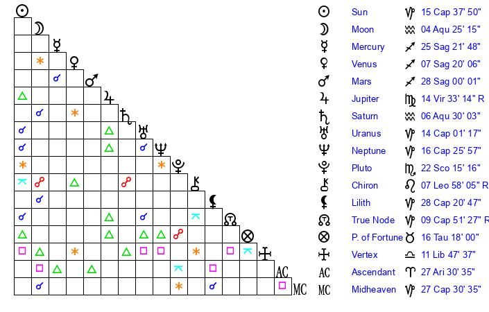 | Mercury | 25 Sagittarius 21 | 27 Sagittarius 34 | 16 Aquarius 27 |