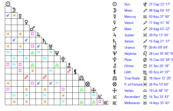 | Saturn | 15 Sagittarius 43 | 15 Pisces 59 | 18 Sagittarius 57 |