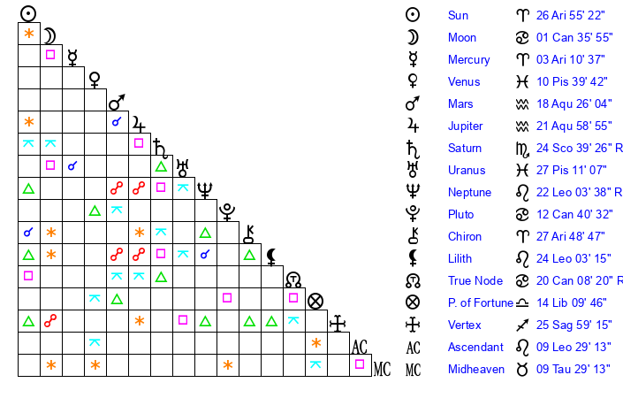 | Saturn | 25 Scorpio 11 | 26 Pisces 21 | 19 Scorpio 55 |