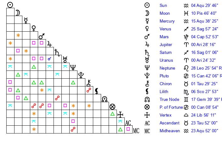 | Moon | 10 Pisces 44 | 18 Sagittarius 48 | 6 Libra 42 |