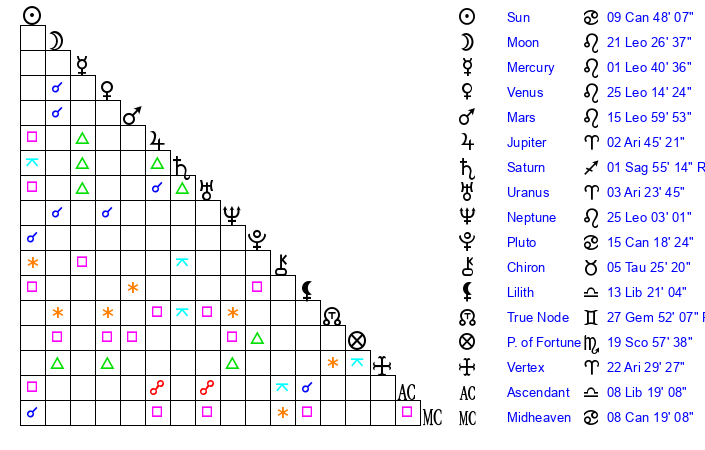 | Moon | 21 Leo 29 | 9 Libra 59 | 13 Pisces 32 |