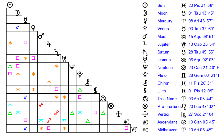 | Sun | 20 Pisces 32 | 21 Pisces 22 | 9 Cancer 13 |