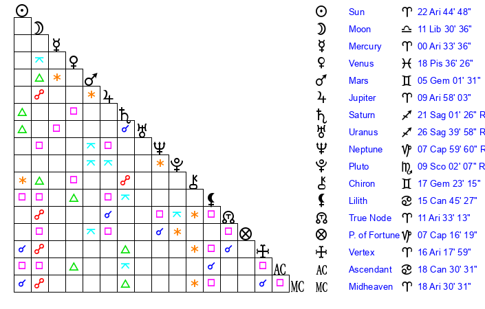 Sun | 22 Aries 45 | 23 Aries 31 | 29 Taurus 38 |