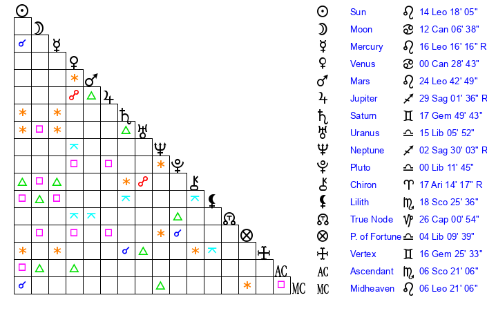 | Moon | 11 Cancer 59 | 12 Capricorn 34 | 21 Gemini 13 |