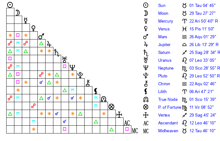 | Moon | 29 Taurus 32 | 9 Aquarius 29 | 19 Scorpio 15 |
