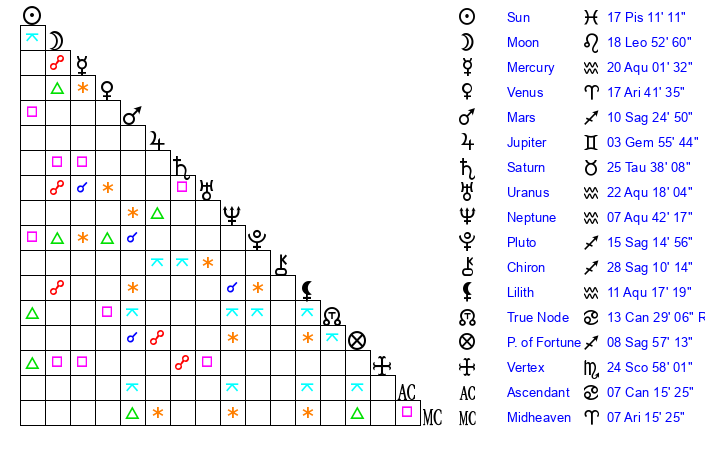 | Sun | 17 Pisces 11 | 17 Pisces 22 | 11 Aries 3 |