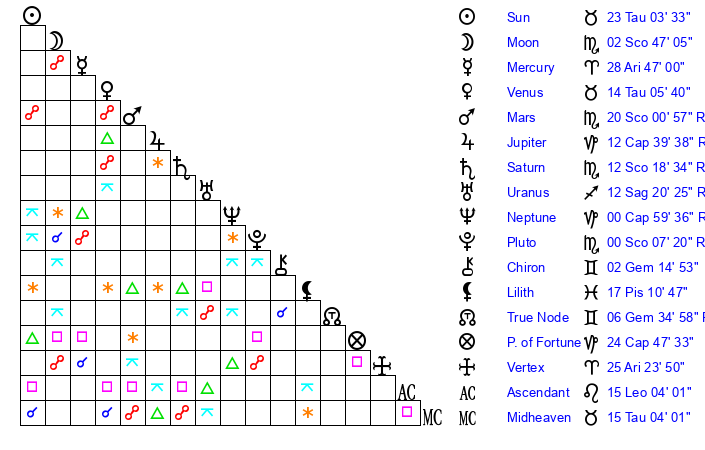 | Uranus | 12 Sagittarius 22 | 27 Taurus 4 | 10 Sagittarius 43 |