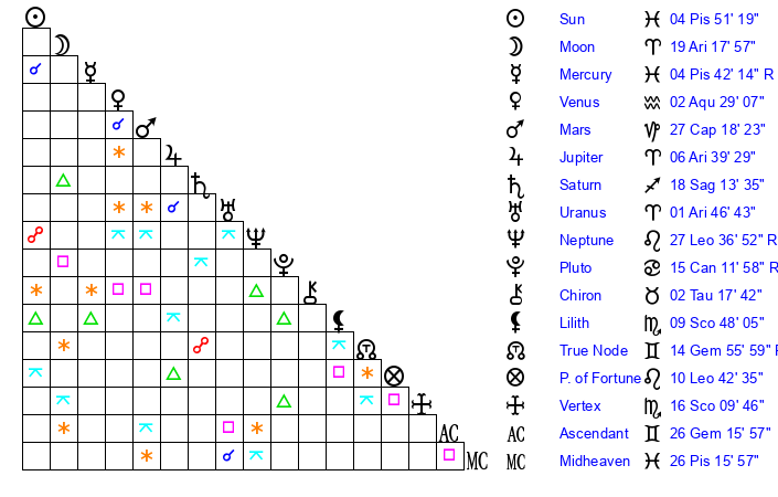 | Mercury | 4 Pisces 42 | 18 Pisces 51 | 3 Cancer 16 |