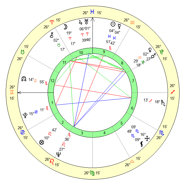| Sun | 4 Pisces 51 | 6 Pisces 20 | 9 Gemini 58 |