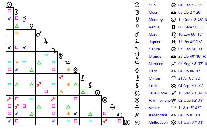 | Moon | 3 Libra 34 | 22 Cancer 20 | 7 Leo 56 |