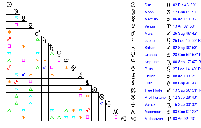 Moon | 12 Cancer 26 | 22 Sagittarius 21 | 21 Capricorn 41 |