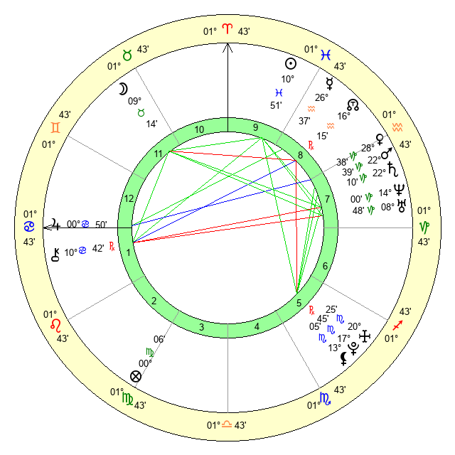 | Sun | 10 Pisces 51 | 11 Pisces 22 | 15 Aries 39 |
