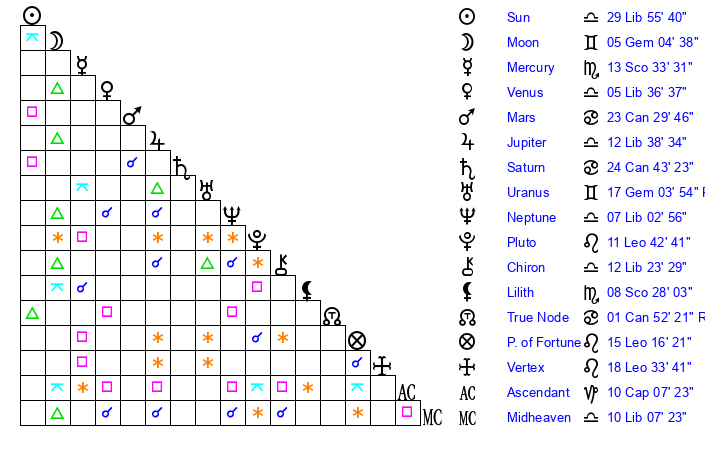 | Neptune | 7 Libra 4 | 29 Pisces 57 | 8 Libra 37 |