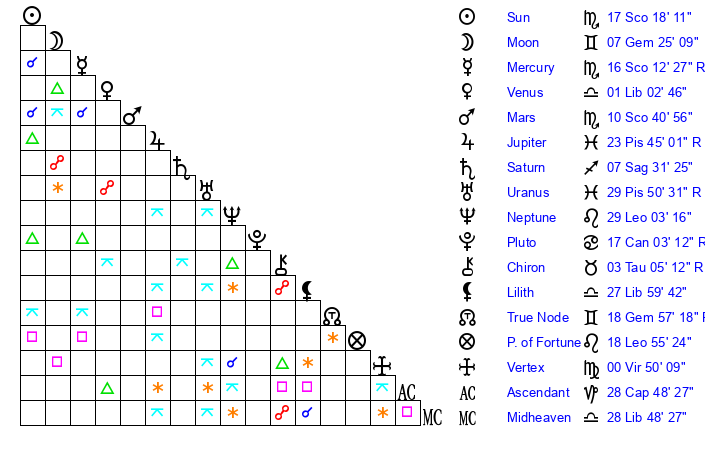 | Sun | 17 Scorpio 18 | 18 Scorpio 33 | 26 Aquarius 48 |