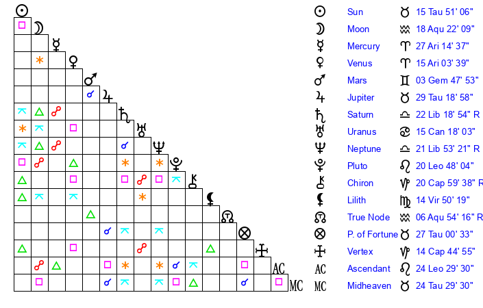 | Saturn | 22 Libra 53 | 28 Pisces 19 | 21 Libra 33 |