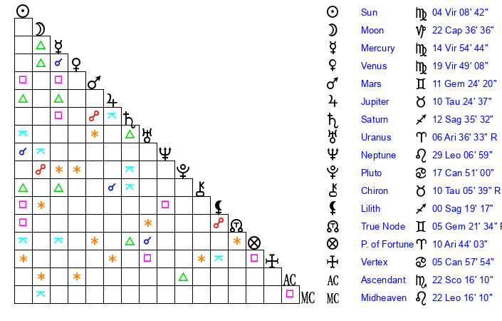| Venus | 19 Virgo 50 | 2 Leo 25 | 18 Capricorn 45 |