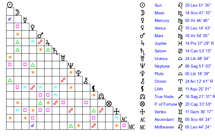 Moon | 14 Scorpio 50 | 1 Virgo 47 | 20 Virgo 44 |