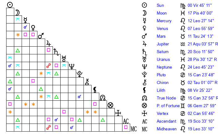 | Sun | 0 Virgo 45 | 1 Virgo 47 | 8 Sagittarius 46 |
