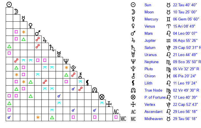 | Moon | 10 Taurus 19 | 4 Sagittarius 13 | 6 Virgo 25 |