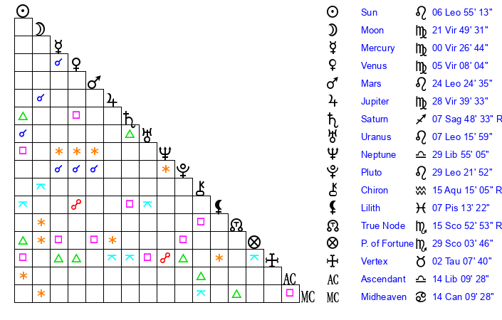| Sun | 6 Leo 55 | 7 Leo 28 | 12 Libra 50 |