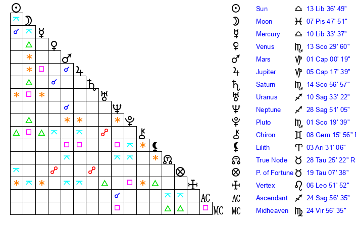 | Sun | 13 Libra 37 | 13 Libra 41 | 24 Scorpio 32 |
