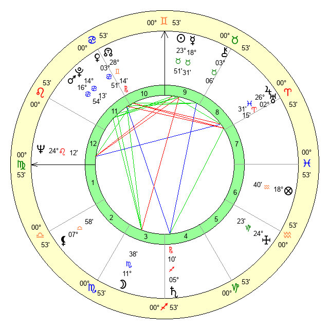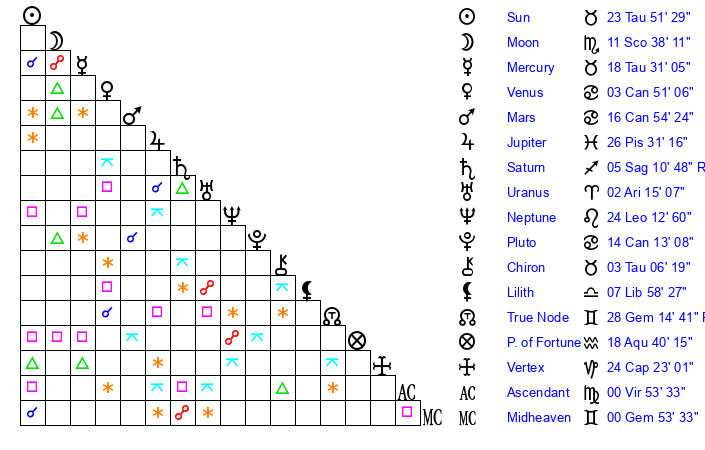 | Moon | 11 Scorpio 41 | 28 Sagittarius 30 | 21 Gemini 23 |