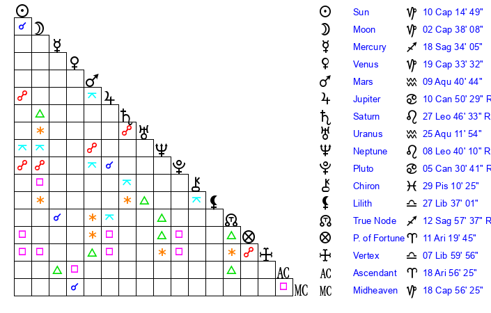 | Venus | 19 Capricorn 34 | 10 Capricorn 6 | 1 Gemini 41 |